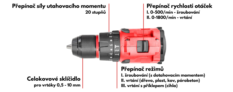 | určeno zejména pro | vrtání, šroubování, vrtání s příklepem |