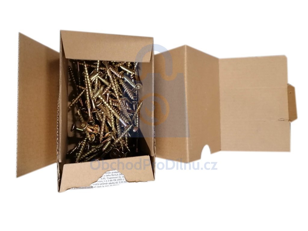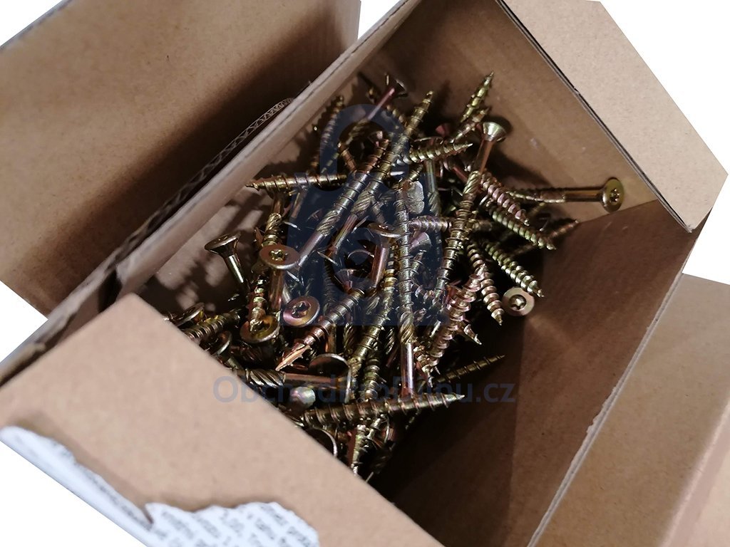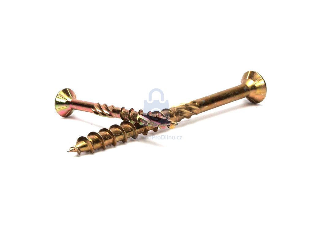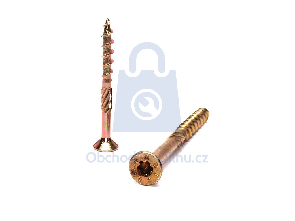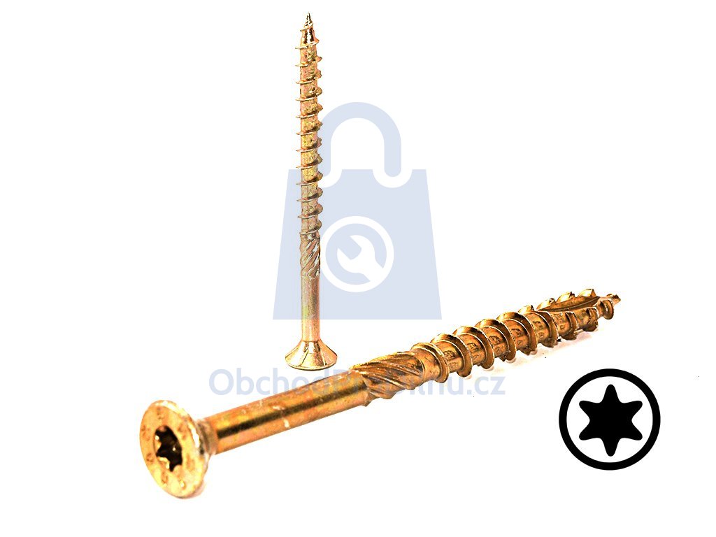 Pro pohon vrutu je k dispozici hluboká drážka TORX (tvar hvězdičky), která zajistí zašroubování bez vyskakování bitu. Vrut je vyroben ze zušlechtěné uhlíkové oceli, která je opatřena povrchovou úpravou ve žlutém zinku. To zajišťuje dostatečnou odolnost vůči vzdušné vlhkosti a korozi. Částečný závit umožňuje k sobě použité materiály opravdu přitáhnout.