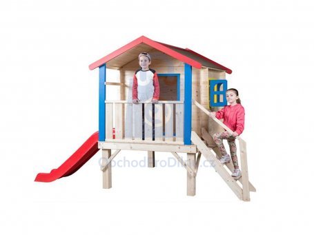 Zahradní domek s podestou, zábradlím a klouzačkou je vysoce kvalitní zahradní domeček, který nabízí vašim dětem bezpečný hrací prostor, jenž si mohou vybavit podle své vlastní fantazie, což zaručeně ocení. Samotný domeček disponuje barevnými okenicemi a zábradlím, díky kterému se budou Vaše děti cítit více v bezpečí, a v neposlední řadě schůdky a skluzavkou, se kterou si užijí spoustu zábavy. Pro prodloužení životnosti tohoto výrobku doporučujeme ošetřit dřevo povrchovou úpravou.