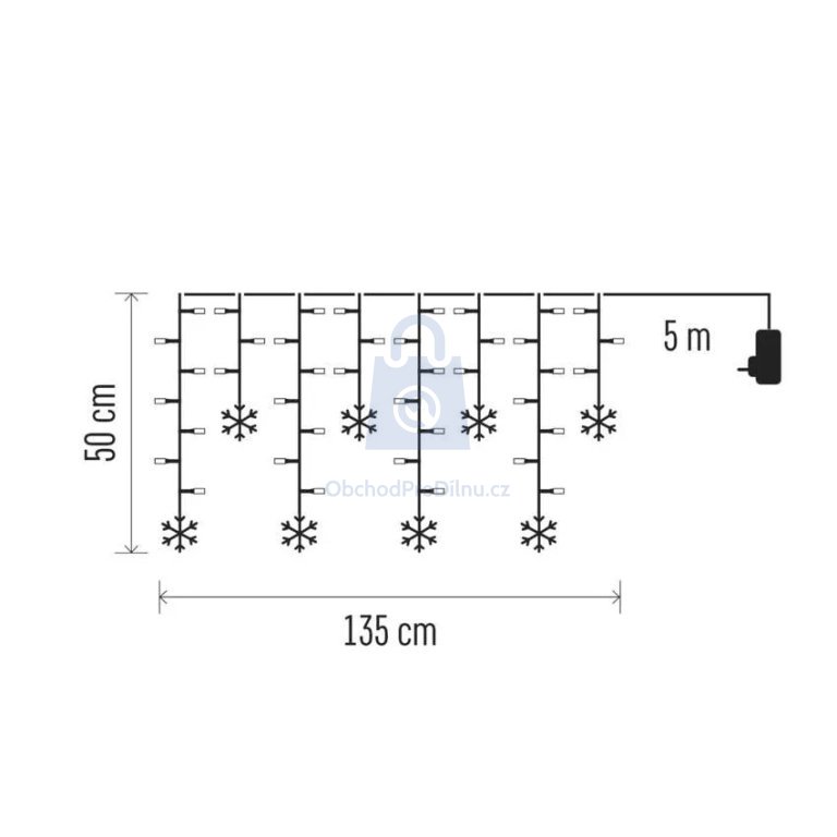 Závěs má rozměry 135 × 50 cm a obsahuje 60 LED diod s nízkou spotřebou energie. Je napájen síťovým adaptérem a disponuje přívodním kabelem o délce 5 m. S příkonem 1,35 W a životností až 10 000 hodin je ideální pro dlouhodobé a bezpečné používání v interiéru.